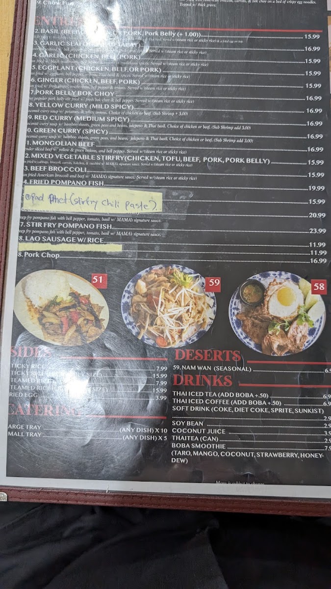 The menu at Mama’s is a culinary journey through Thailand and Laos, featuring an array of dishes that will tantalize your taste buds. Standout offerings include the Laab Chicken and Laab Beef, both bursting with aromatic herbs and spices, and the uniquely satisfying Papay Lao and Tum Mua salads. For those seeking a warm and hearty dish, the beloved Thai Boat Noodle Soup comes highly recommended, with its richly flavored broth and generous toppings of steak slices, pork belly, and fresh veggies, all beautifully intertwined in a delightful dance of flavor.